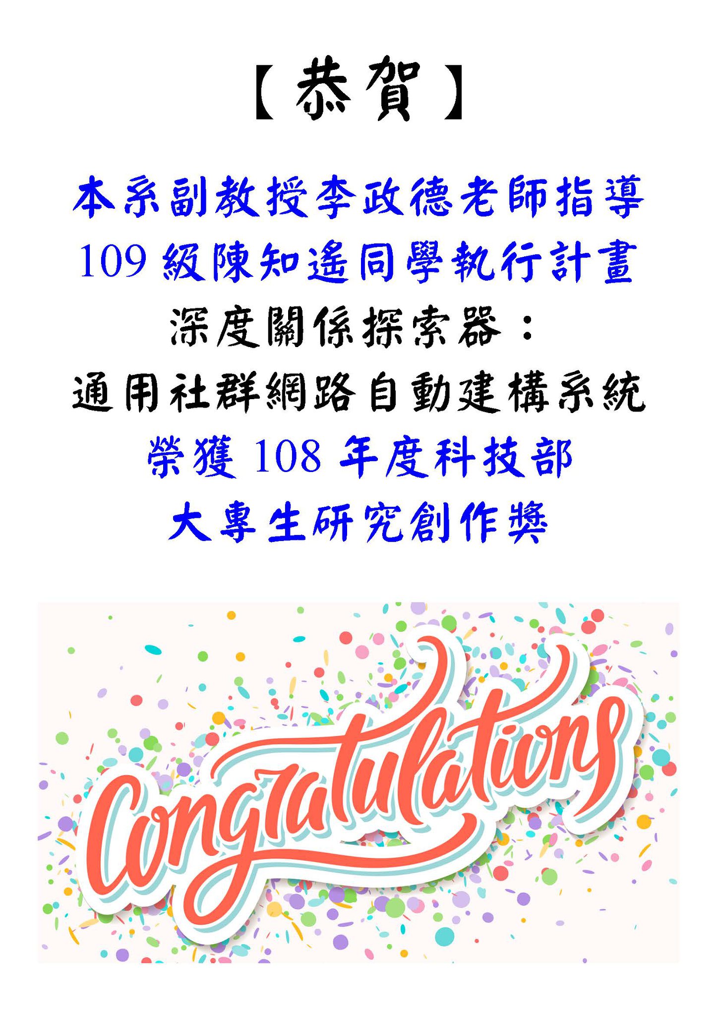 【恭賀】數據所李政德老師 指導109級陳知遙執行計畫 榮獲 108年度科技部大專生研究創作獎