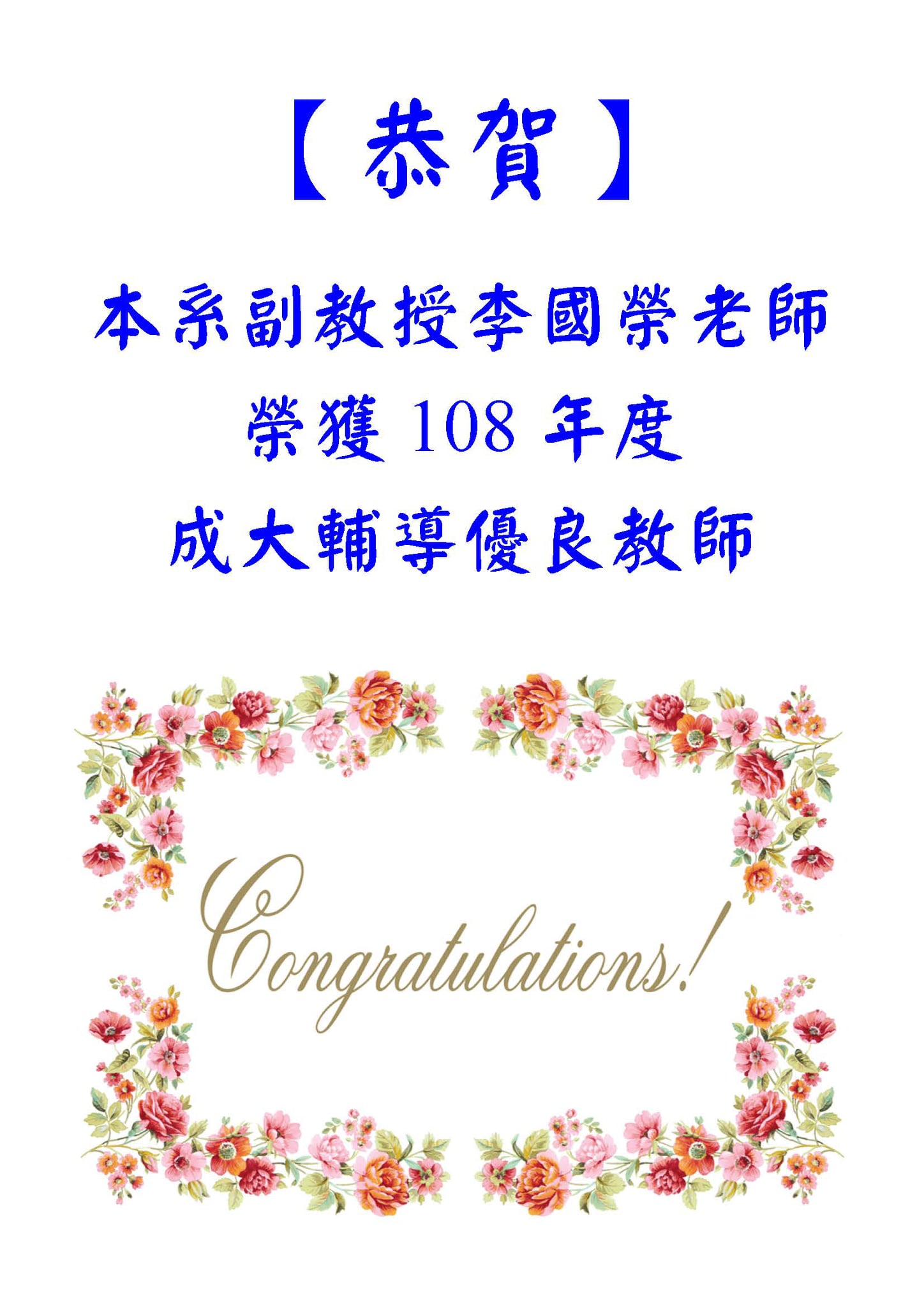 【恭賀】李國榮老師 榮獲 108學年度「校輔導優良教師」